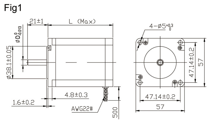 | Model | Step Angle (Deg) | Voltage (V) | Current (A) | Resistance (Ω) | Inductance (mH) | Holding torque (Kg.cm) | Detent torque (Kg.cm) | Rotor Inetia (g.cm²) | Wdg | Length (mm) | Weight (Kg) | Shaft Diameter |